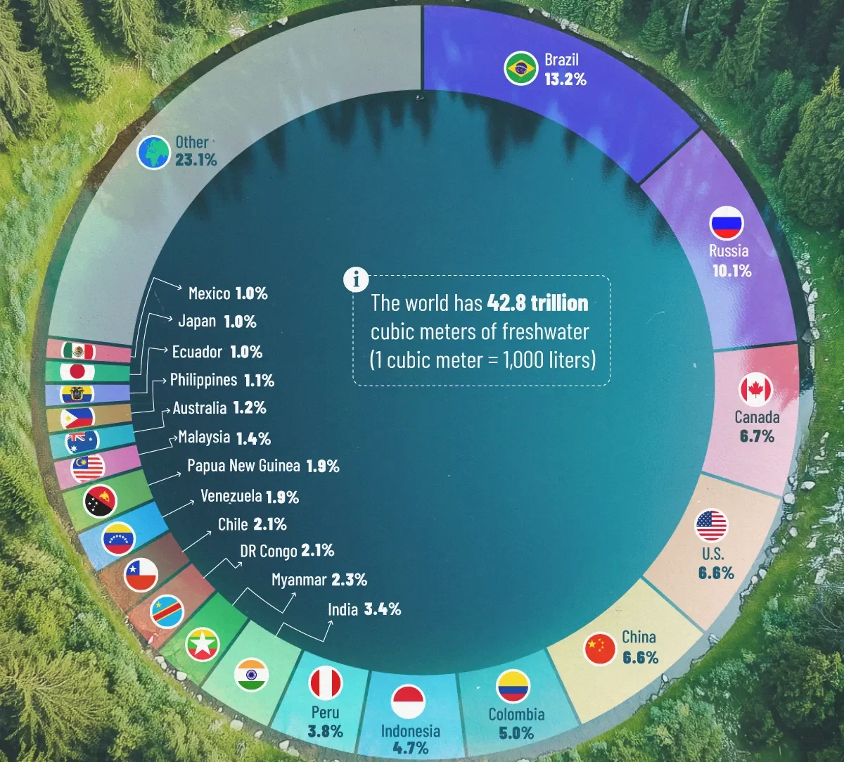 Brazil, Russia, Canada, the United States, China, Colombia, Indonesia, Peru, and India together control around 60% of the planet’s freshwater resources.