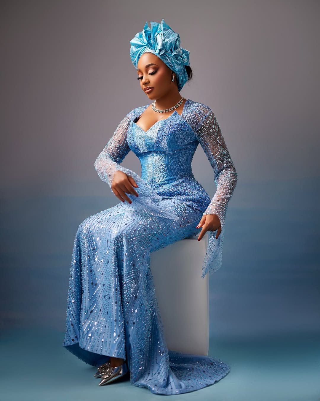 Kiky Festus presented a breathtaking image in a custom-designed fitted powder blue mermaid gown. The gown featured a structured corset bodice and a sophisticated sweetheart neckline, complemented by sheer long sleeves meticulously covered in shimmering crystals and rhinestones from shoulder to wrist.