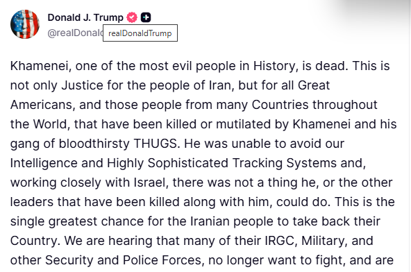 US President Donald Trump confirmed Khamenei's death on Truth Social, branding him 'one of the most evil people in History' and asserting that his killing represented 'Justice for the people of Iran' and global victims.