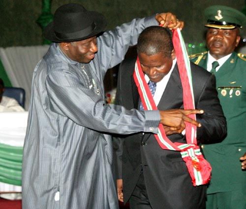 13. He became the first non-government official to receive Nigeria's GCON honour. In 2011, President Goodluck Jonathan awarded him the Grand Commander of the Order of the Niger, Nigeria's second highest national honour. No private citizen had received it before him.