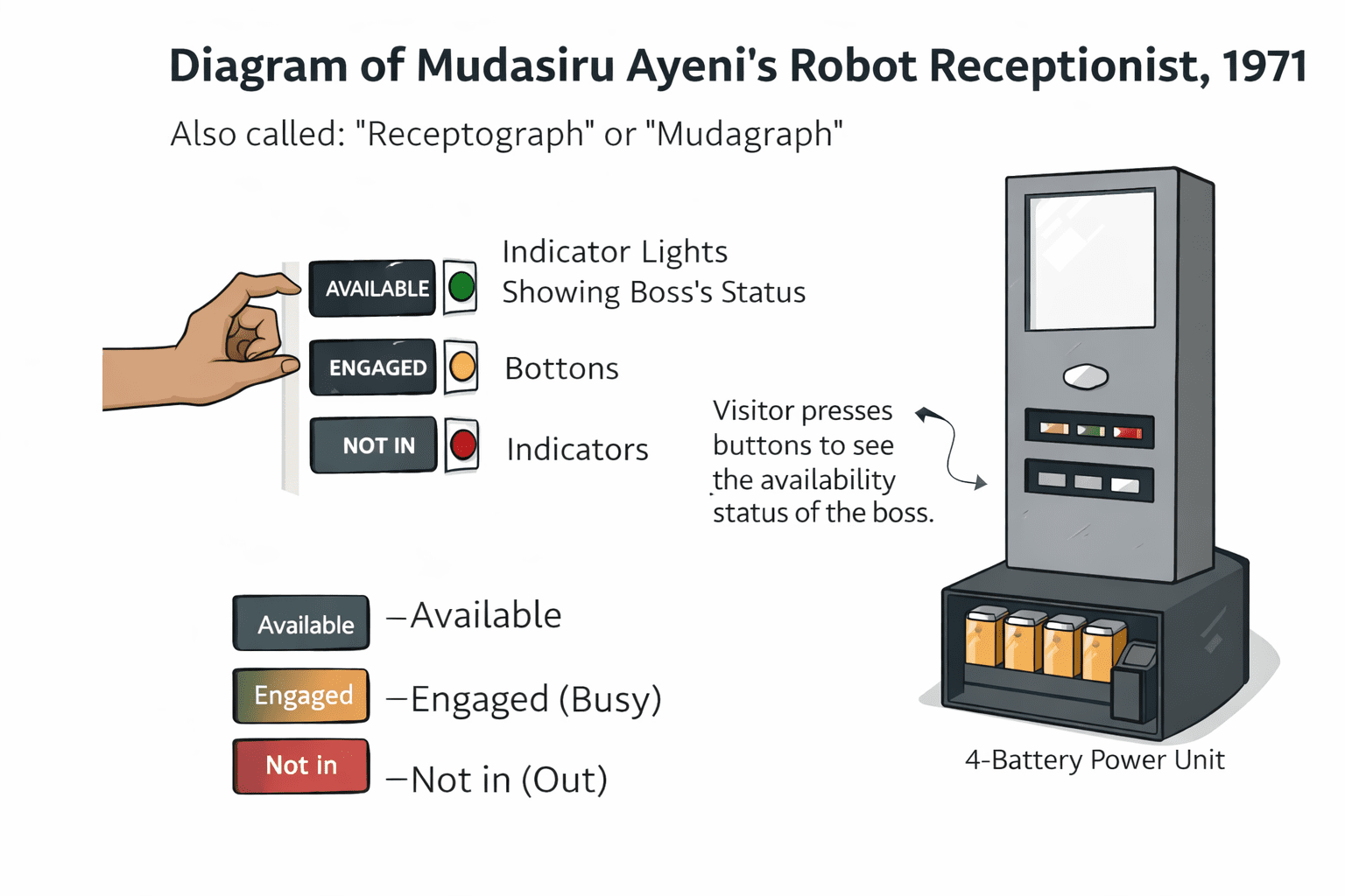 This is what actually happened: Mudashiru Ayeni, a young Nigerian student in the early 1970s, invented a battery-powered automated office device he called the “Muda-graph” or “Receptograph.” The machine functioned as a simple robot receptionist: when a visitor pressed a button, it indicated whether the boss was available, engaged, or not in.