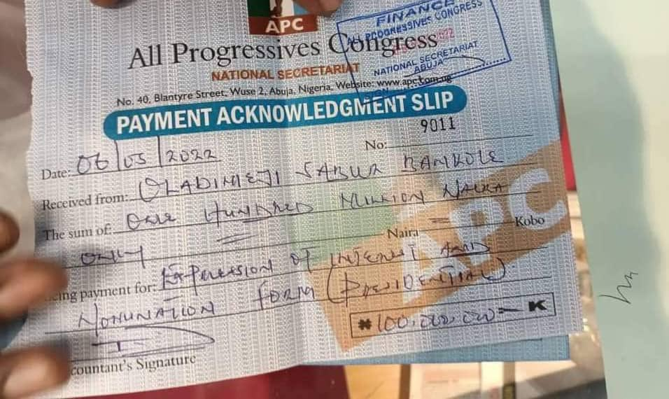One hundred million naira, not in total. Just to buy the form.