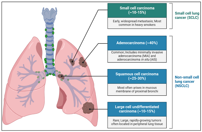 Lung cancer is a disease characterized by the uncontrolled division of abnormal cells in lung tissue. These cells form tumors that interfere with the functioning of the lung and also have the potential to spread to other parts of the body. The disease is not a single entity. It appears in two main forms that behave differently and require different treatment approaches.