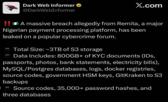 A threat actor identifying as "bytetobreach" has allegedly exfiltrated approximately 3 terabytes of data from cloud systems linked to Remita, one of Nigeria's most critical digital payment platforms, operated by SystemSpecs and responsible for powering the country's Treasury Single Account.
