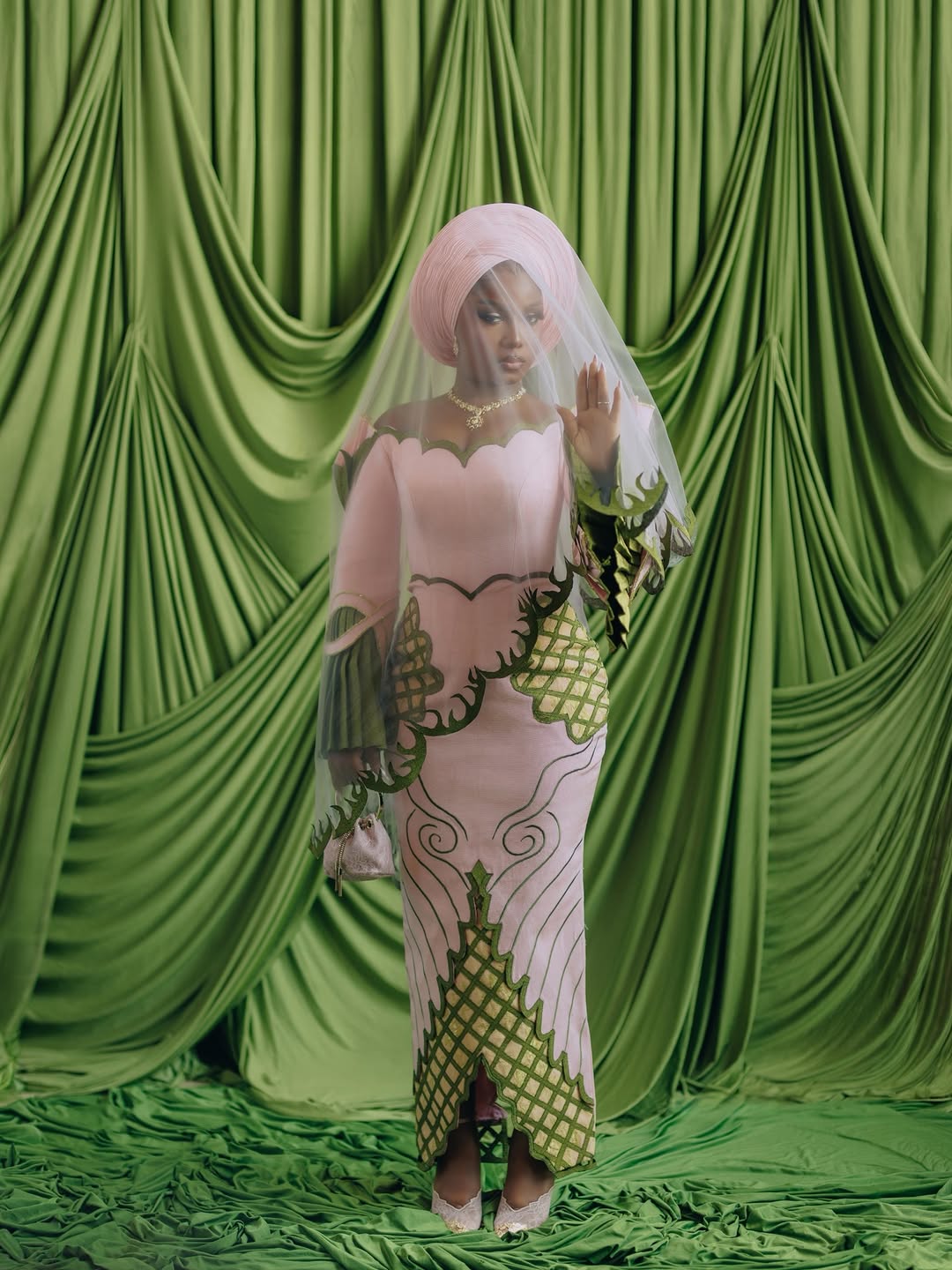 She completed her ensemble with a blush pink gele, tied in a structured, rounded style, a tasteful gold necklace, and a small pink drawstring pouch.
