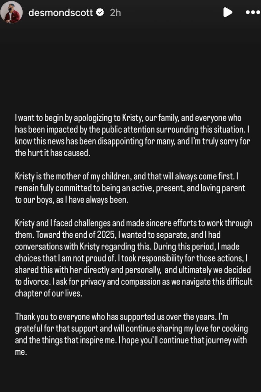 Desmond later admitted, in an Instagram story, he wanted to separate toward the end of 2025 and made "choices I'm not proud of" during that period which is just a careful way of acknowledging the infidelity that shattered their marriage.