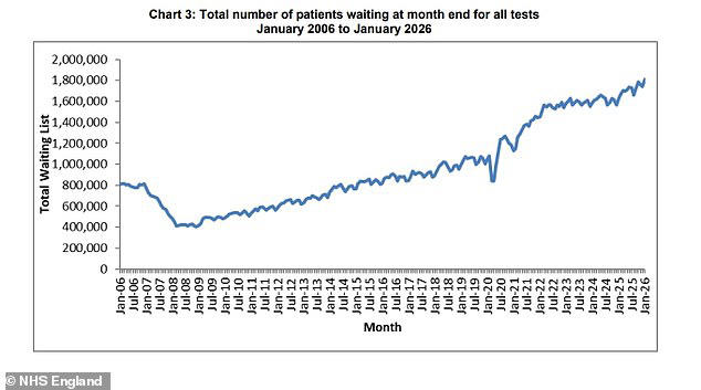 By the end of January 2026, almost 1.8 million people were waiting for tests such as MRI scans, CT scans, ultrasounds, endoscopies, and heart investigations.