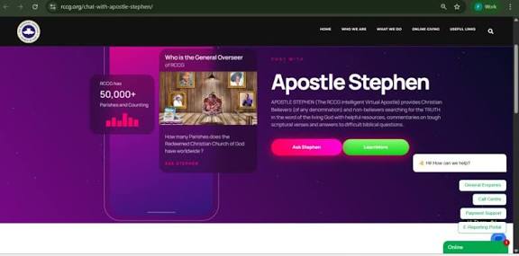 The Redeemed Christian Church of God (RCCG) created an AI chatbot, Apostle Stephen, which greets users with: “Hi there, I am Apostle Stephen, the RCCG Digital Missionary. How may I help you today?”